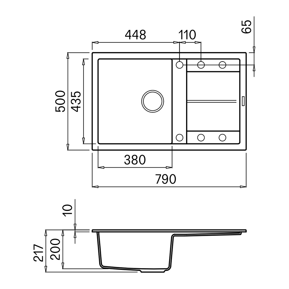 Integrovaná oblast pro příslušenství v odkapávači, vybavená předvrtanými otvory, které vám umožňují instalovat doplňky: excentrické ovládání odpadu, dřezovou baterii s vytahovací sprchou a dávkovač saponátu.