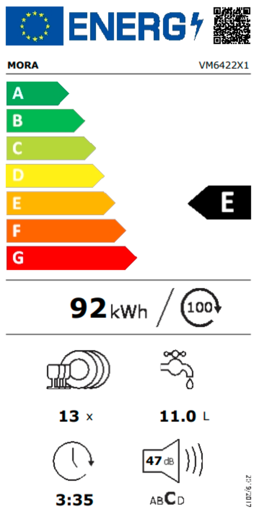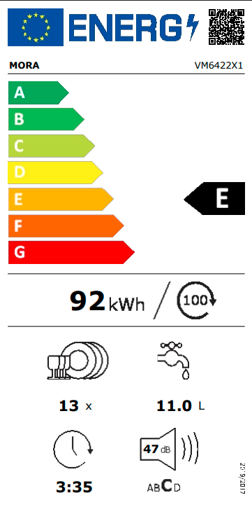 Vestavná myčka MORA VM 6422 X1 v energetické třídě E ve standardní šířce 60 cm má kapacitu 13 sad nádobí. Je vybavena dvěma koši a příborovým košíkem. Ovládací panel je opatřen dotykovým ovládáním s displejem. Praktická funkce RychléMytí umožňuje zkrátit délku vybraných programů. Samozřejmostí je úsporný ECO program nebo praktický odložený start, který umožňuje nastavení startu programu až do 24 hodin. Myčka má navíc praktický samočisticí filtr, který automaticky odstraní zbytky mastnoty a jídla ve filtru a zamezí nesprávnému chodu spotřebiče. Má také automatický program pro čištění celého vnitřku myčky včetně ramen a trysek. Se systémem AquaStop se nemusíte obávat nemilého překvapení v podobě vytopení.